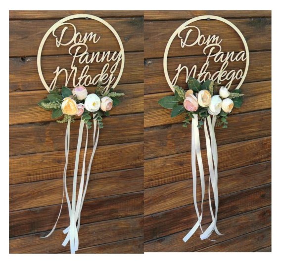 Wianki na drzwi Dom Panny Młodej Dom Pana Młodego z kwiatami ecrue i łososiowo - różowymi - komplet 2 szt